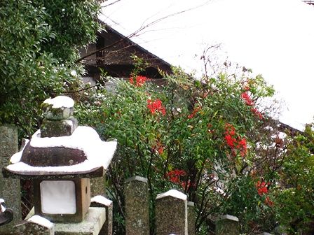 白い雪に真っ赤な南天の実が映えます。