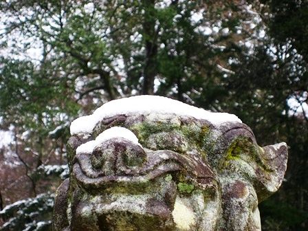 手向山八幡宮の狛犬の頭と鼻の上に雪が積もっています。