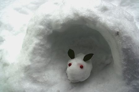 私の自作の雪ウサギをミニかまくらの中に入れてみました。