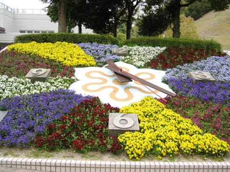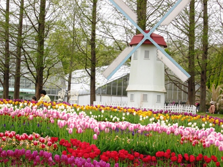 入り口では、花時計が出迎えてくれます。いかにも記念撮影用って感じで、もちろん、写真を撮りました。入ると一面チューリップ畑と言う感じですね。パンジーもたくさんあります。風車があって雰囲気を出してますね。小さい子供達が遊べるようなスペースもたっぷりあります。京都府立植物園と違うのは、小高い山がある事です。登ると展望台になっていて眺めは最高です。ここでお弁当を頂きました。