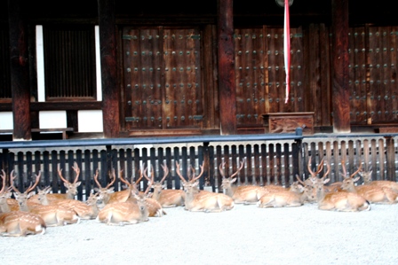 そして、帰りに興福寺を通ったら、東金堂の前に鹿の集団が。今すごく角が伸びているので、ちょっと勇ましい光景でした。