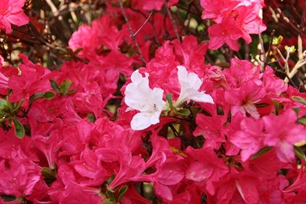 赤いツツジの中に白いツツジが。「逆・紅一点」です。
