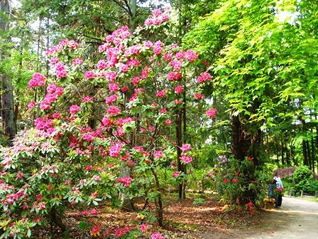 緑の中の西洋シャクナゲが映えますね。とっても綺麗。バラ園も近くで見ると綺麗でしょうねえ。
