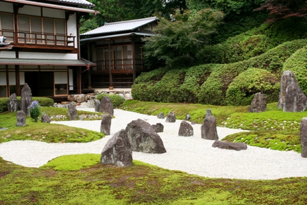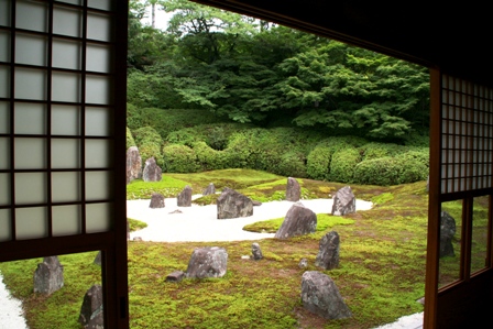 本当にすぐ近くにありました。私の他には誰もおられなくて、おそるおそる入って行きました。そこには、見た事もない景色がありました。何と形容したら良いのか言葉が見つかりませんでした。白砂に苔の緑、そして色々な形の石。良くある枯山水とはちょっと違った雰囲気です。私一人だったせいもあって、そこだけ別世界のようで、静寂の中にポツンと立ってお庭を眺めていました。