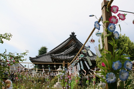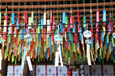 お陰で到着したのが4時です。5時までたっぷり1時間あります。もう境内はガラスの風鈴が一杯吊るされていて、とても涼しげです。そして、チリンチリン・・・と言う音の大合唱です。本堂の前には昔ながらの鉄の風鈴が無数に並べられていて、お堂にマッチしていました。