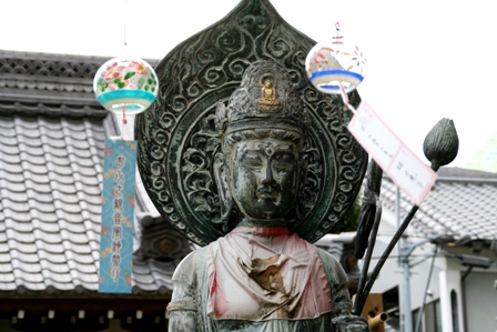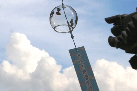 観音様と風鈴の珍しい2ショット写真も撮れました。夏空を借景にした風鈴もなかなか素敵です。最初はミスマッチなんて思ってましたが、境内に風鈴がすっかり溶け込んでいて楽しい空間でした。