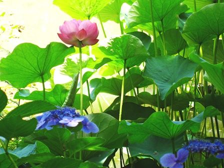 蓮と紫陽花のコラボの写真、ピンクとブルーがお互いの良さを際立たせていて好きな写真です。