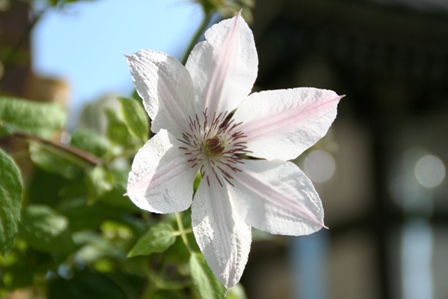 それから、すっかり覚えましたテッセンが綺麗に咲いていました。今まで見たテッセンはうすい紫やピンクが多かったですが、これは白っぽい色でした。良く見ると白地にピンクの線が入っていますね。