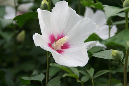 ムクゲは良く近所で見かけるのが薄紫色なので、白いのはちょっとハイビスカスみたいで夏っぽいですね。