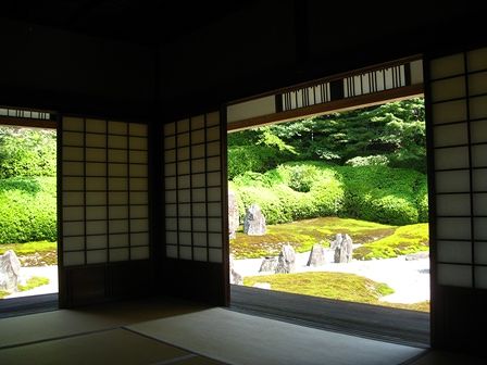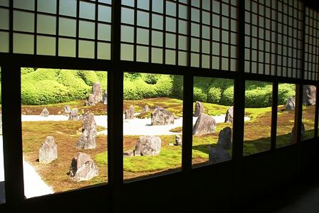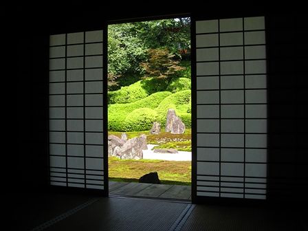 東福寺の天得院も白砂に青いキキョウが涼やかでしたが、お座敷から見る光明院の庭が風流ですね。