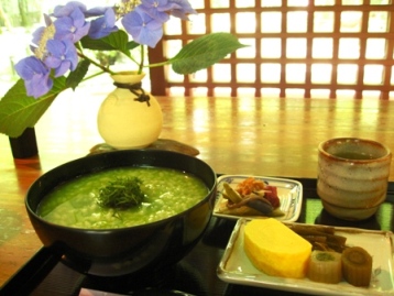 お抹茶の入った冷たいお粥、もう猛暑の奈良には最高です。