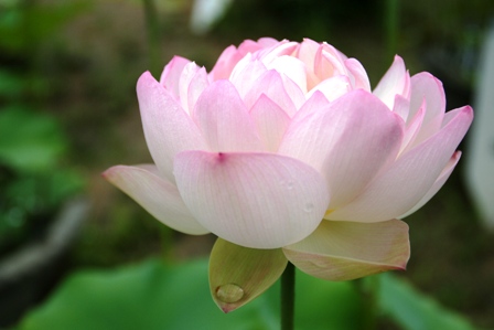さて、喜光寺の蓮のご紹介は2度目ですので、今日は雨とか水滴とかをテーマに写真を選んでみました。最初は錦旗と言うとっても可愛いピンクの蓮なんですが、良くご覧下さい。花弁の一番下に水玉が出来てるでしょ。水滴が付いてるというより、きれいなまん丸な水玉が出来ていて可愛かったです。