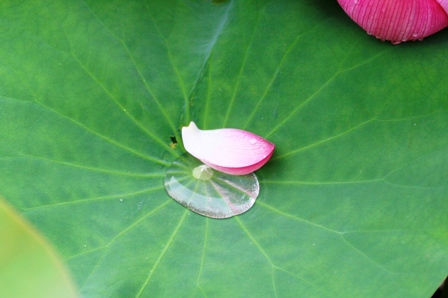 それから、蓮の花はだいたい葉っぱより背が高いんですが、大きな葉っぱの下で雨宿りをしてるお花がありました。次は花びらが一枚はらりと葉っぱに落ちてたんですが、それはよくある光景なんですが、葉っぱに水溜りが出来ていて、その上に花びらが落ちて浮いているので、透明な水玉にピンクの模様が付いているんです。ちょっと神秘的で見入ってしまいました。