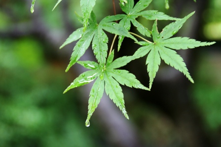 雨の水滴が落ちる直前のもみじ