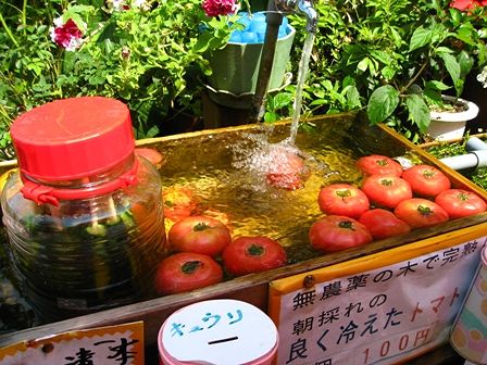 冷やしたトマトやキュウリの浅漬けが売られています。