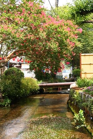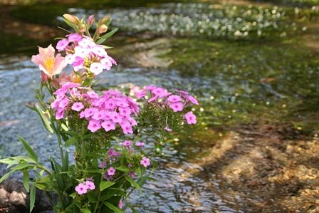 川の中の生け花が素敵です。ご近所の方に感謝です。