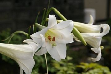 川辺にはいろんな花が咲いています。白いユリの花が涼しげです。