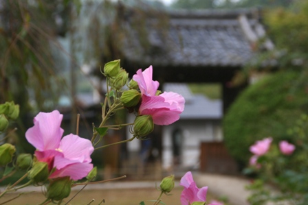 山門を借景にピンクのフヨウ