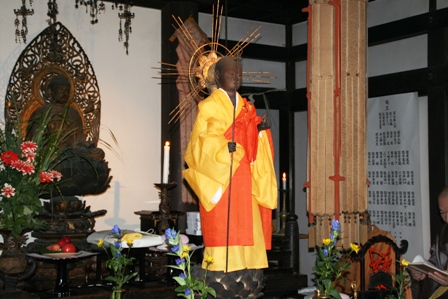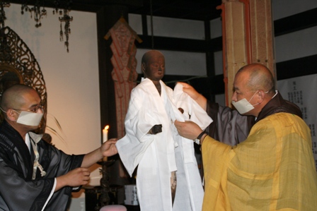 その着せ替え法要を拝見して参りました。マスクをされたお坊さんがお二人で、厳粛に今羽織っておられる衣を脱がされ、新しい衣に着せ替えられました。本当に衣の下は裸でした。とても華奢で、でも美しい体型でした。ちなみに、古い衣は切り分けられて、お守りにされるそうです。