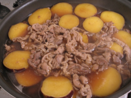 ネットで調べてサツマイモと豚肉の煮物を作りました。湯気でくもってます。