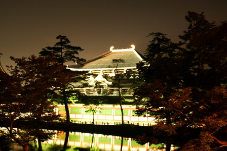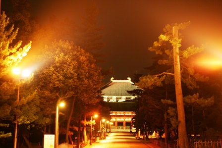 南大門辺りからの中門と大仏殿 まぶしい位にライトアップされてます