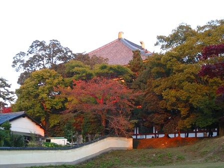 大仏殿に夕日が当たって真っ赤になっています。
