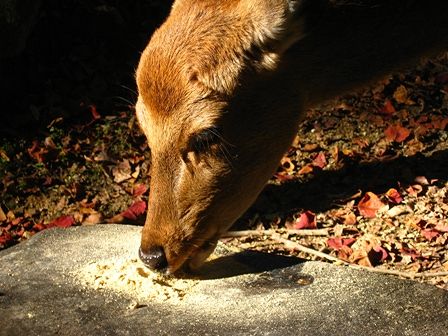 お店の前できな粉を食べてる鹿さん。きっとお店の方からのご馳走でしょうね。