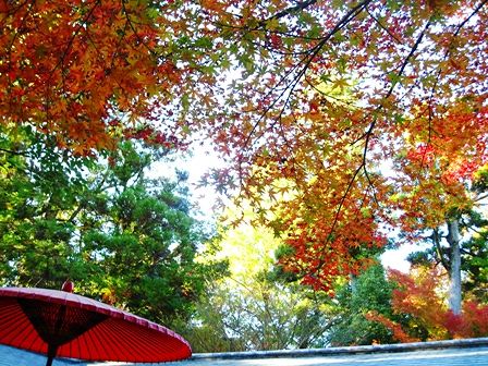 赤い傘と紅葉の競演
