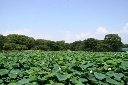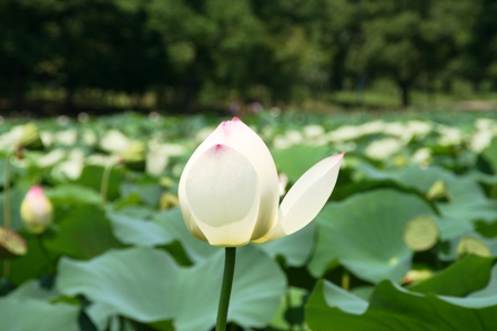 でも、残念ながら、蓮は正直にほとんど閉じていました。これが早朝だったら、もう見事に満開で綺麗だったでしょうね。でも、この時間でも充分に楽しめました。白くて花弁の先がほんのりピンク色の私が結構好きなタイプの蓮です。出来れば蓮の何と言う種類の花なのかどこかに書いて欲しかったですね。公式HPにもハスとしか載っていませんでした。