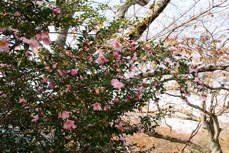 桜の木の隣にピンクの山茶花が満開でまるで桜が咲いているようでした。