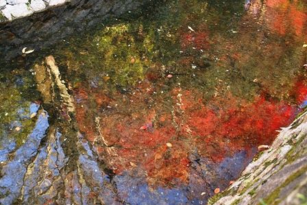 疎水に映る青空と紅葉と木 まるで油絵のようです。