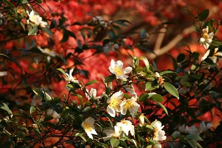 紅葉を借景に白い山茶花を撮ってみました。