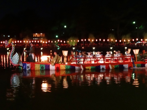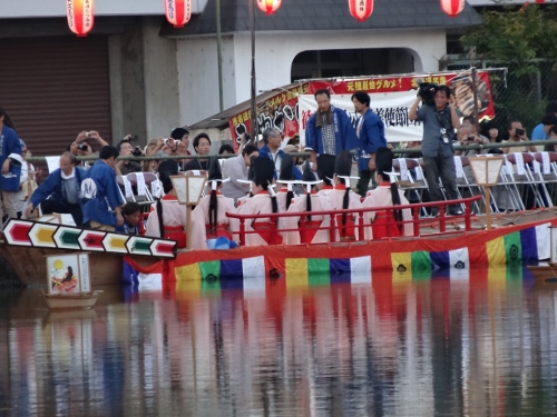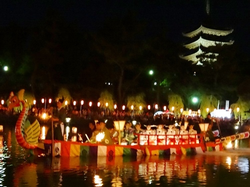 五重塔を借景にした龍頭船です。花扇を積んでいます。