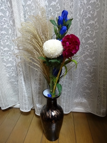 花扇のお裾分けを頂きました。ススキとケイトウとリンドウと菊です。