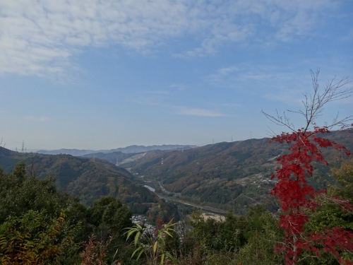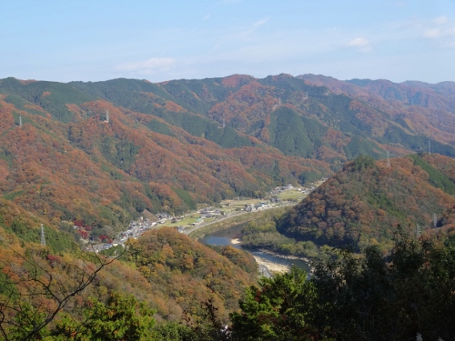 山がかなり紅葉しています。川が流れて素敵な光景になってます。