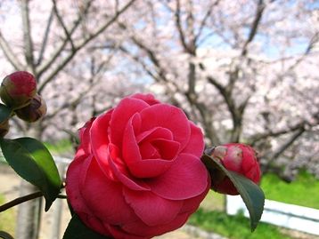 真っ赤な椿とソメイヨシノ