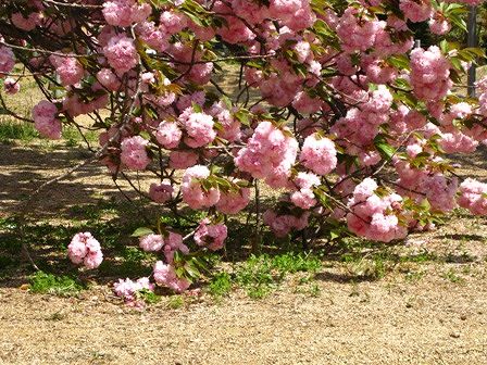 八重桜のお花の重さに耐え切れず、こんな事になってます。