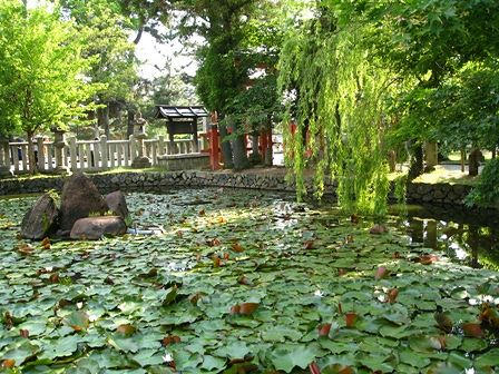 氷室神社の池 睡蓮の葉っぱで一杯です。
