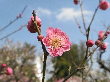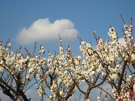 青空を借景に白い雲と白い梅
