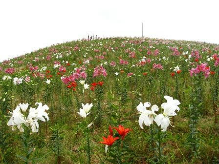 濃いピンクと白、つまり紅白のユリの群生 山頂の方まで咲いています。