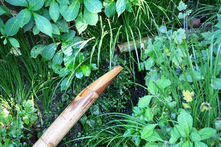 そして、突然、「カーン!」という音がしました。鹿(しし)おどしです。鹿おどしとは、水を引き入れた竹筒が、水の重みで反転し、石を打つ仕掛けです。もとは田畑を荒らす動物を追い払うための民具だったそうです。庭園に使ったのは、ここ詩仙堂が始まりなんだそうです。