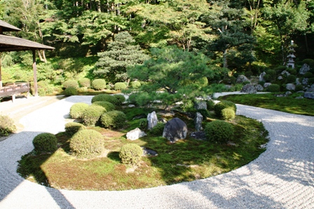 曼殊院は何と言っても白砂の枯山水です。そう、私の大好物です!白砂はもちろん、水の流れを表してるんですが、ここには、鶴島と亀島と言うのがあります。樹齢400年の五葉松で鶴を表現してるそうです。そう言われれば、そう見えますかね。