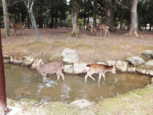 片岡梅林の池で鹿さんが足湯の様に浸かっています。