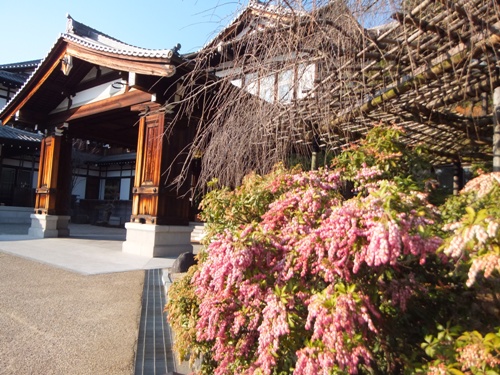 奈良ホテル玄関前に真っ赤なアセビが咲いています。