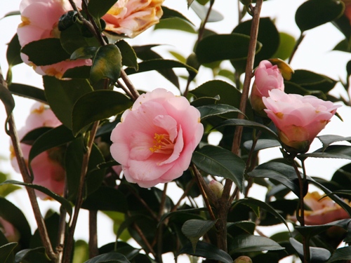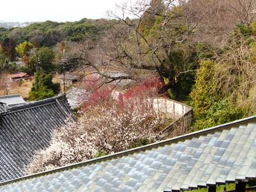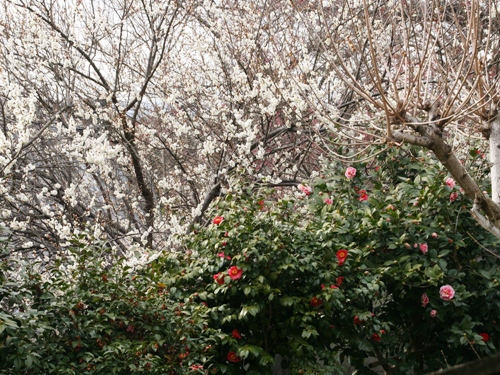近くで見ると白梅と赤やピンクの椿のコラボが見られます。