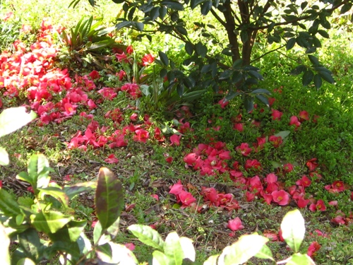 赤い椿が大量に落ちてます。白いのは、落ちたらすぐに傷むみたいですが、