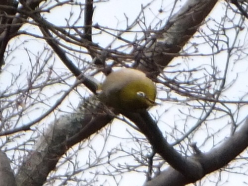 指図堂の前の木にメジロがいました。すごい体勢です。ひっくり返ってます。
