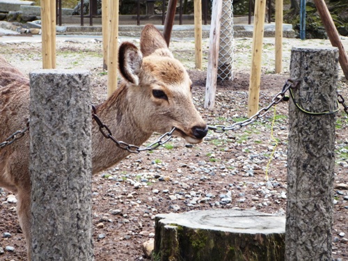 東大寺の参道で良く見かけるシーン。鎖をガシガシする鹿さん。