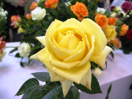 予想以上にすごい人でした。バラは綺麗だし、素敵だし、良い香りだし、文句ないのですが、人の凄さに私も主人もちょっと気持ち悪くなってしまいました。ちなみに、入場料は500円。65歳以上と中学生以下は無料です。会場の中でローズティが頂ける喫茶コーナーがありまして、順番を待ってやっと座る事が出来ました。お菓子付きで1杯500円です。バラの香りがして美味しかったのですが、紙コップだったんですよねえ(>_<)せっかく上品なウエイトレスさんがいて、感じ良かったのに、残念です。やっぱり、霊山寺のローズティが最高ですね。