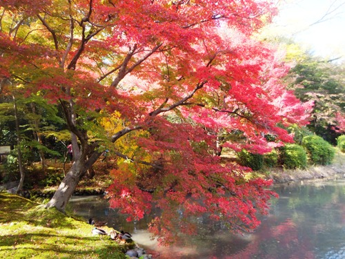 池の畔の紅葉が見事です。その下には、カモ達がいました。